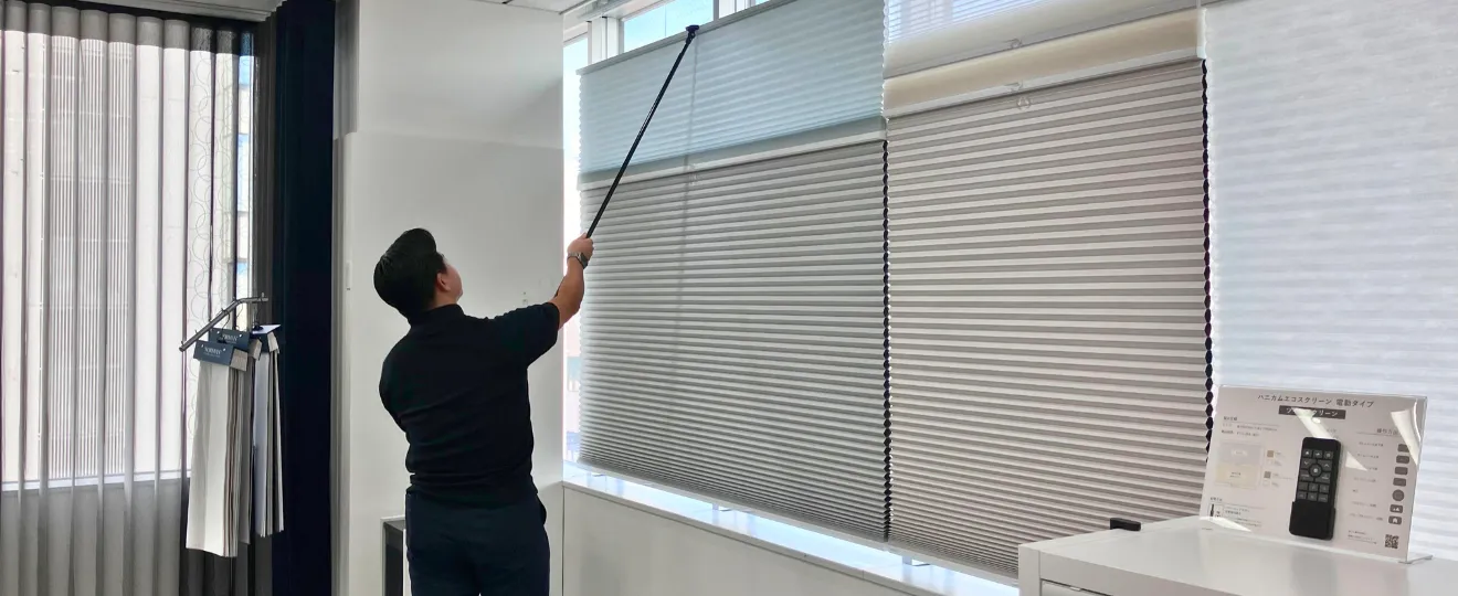 質感や光の透け方は写真だけでは伝わりません。ショールームでは、窓に設置されたハニカムエコスクリーンや、サンプルを手に取りながら、照明や自然光での見え方を体感できます。当社ショールームで、ぜひお確かめください。