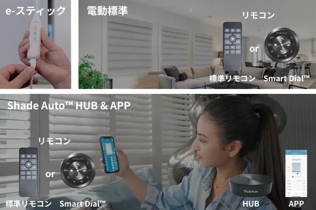 | 電動モデル | e-スティック | 電動標準タイプ | ShadeAuto™ HUB&APP | ||||