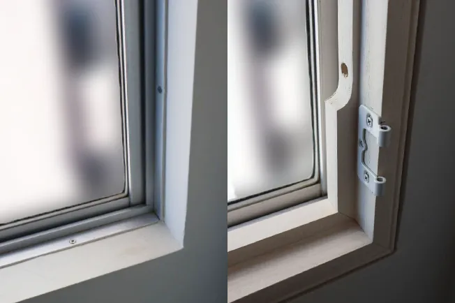 Zフレームなら飾り縁で窓枠を隠せます。窓枠内に納める設置方法なので見た目もすっきり。壁や床のリフォームと同時施工もしやすく、仕上がりも美しくまとまります。Zフレームは窓枠内専用です。様々な条件でZフレームが設置できない場合もあります。このような場合は、「Lフレーム外付け」で窓枠ごと覆う方法もあります。ぜひスタッフにご相談ください。