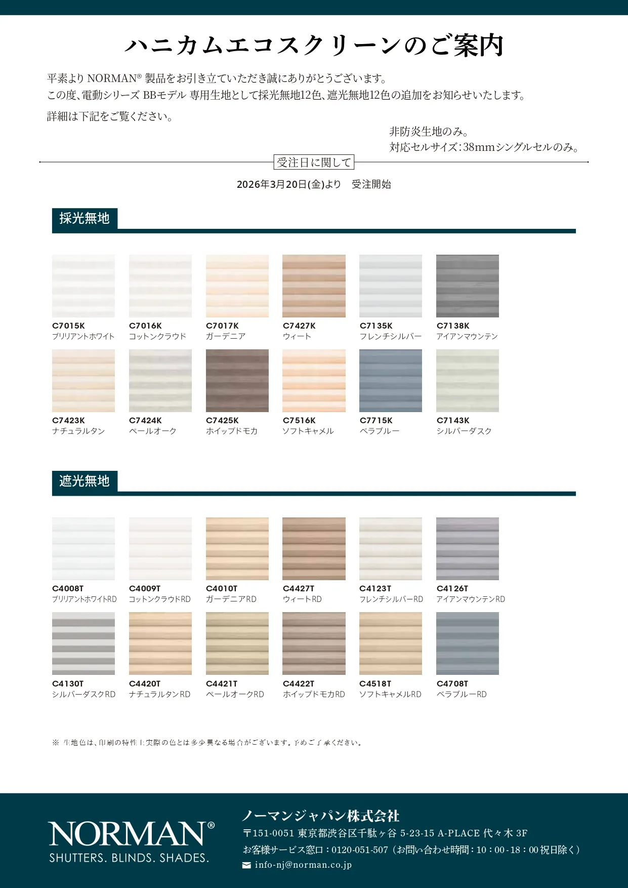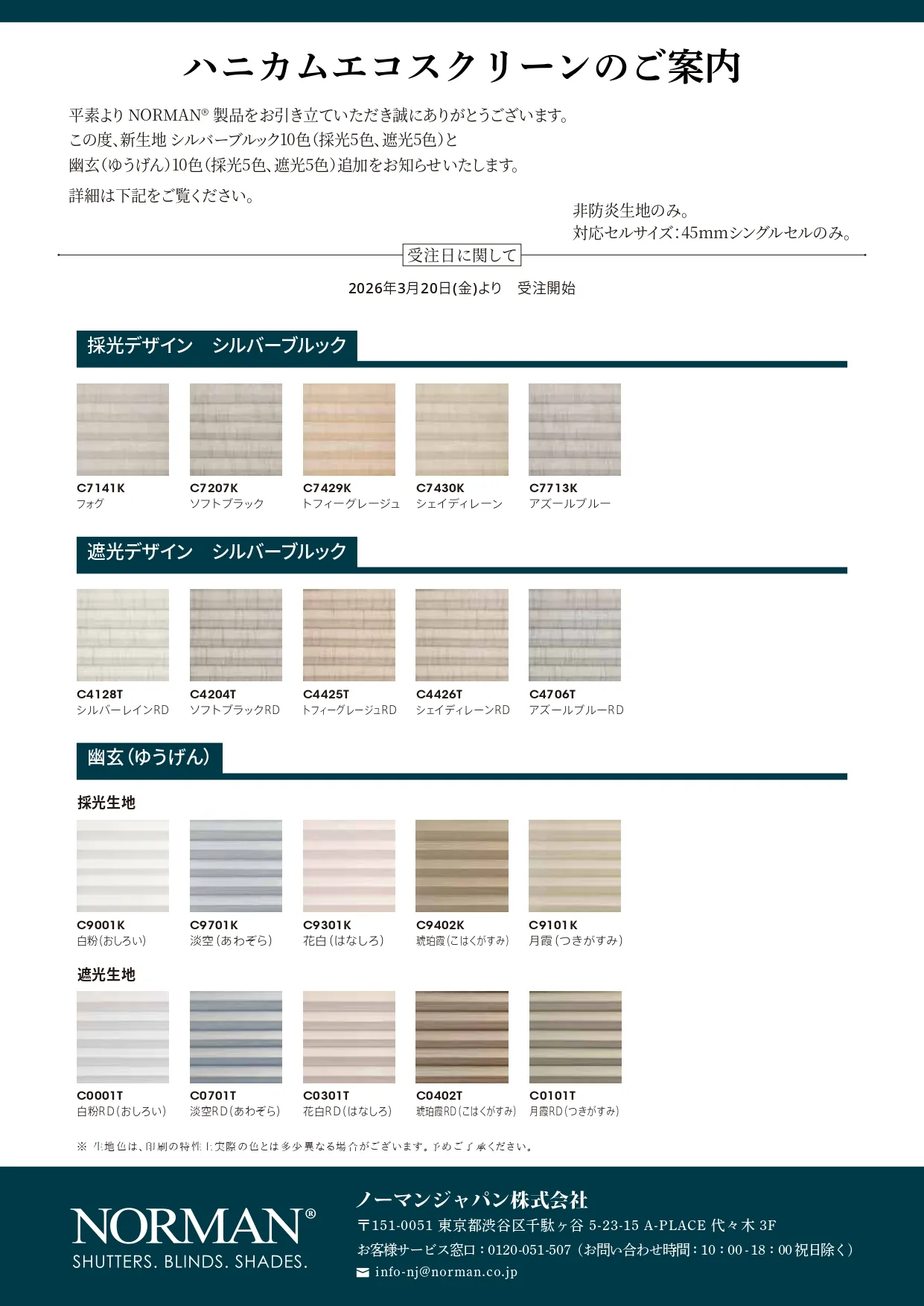 NORMAN®ハニカムエコスクリーン 電動タイプ「BBモデル」専用生地、新生地『シルバーブルック』『幽玄(ゆうげん)』追加