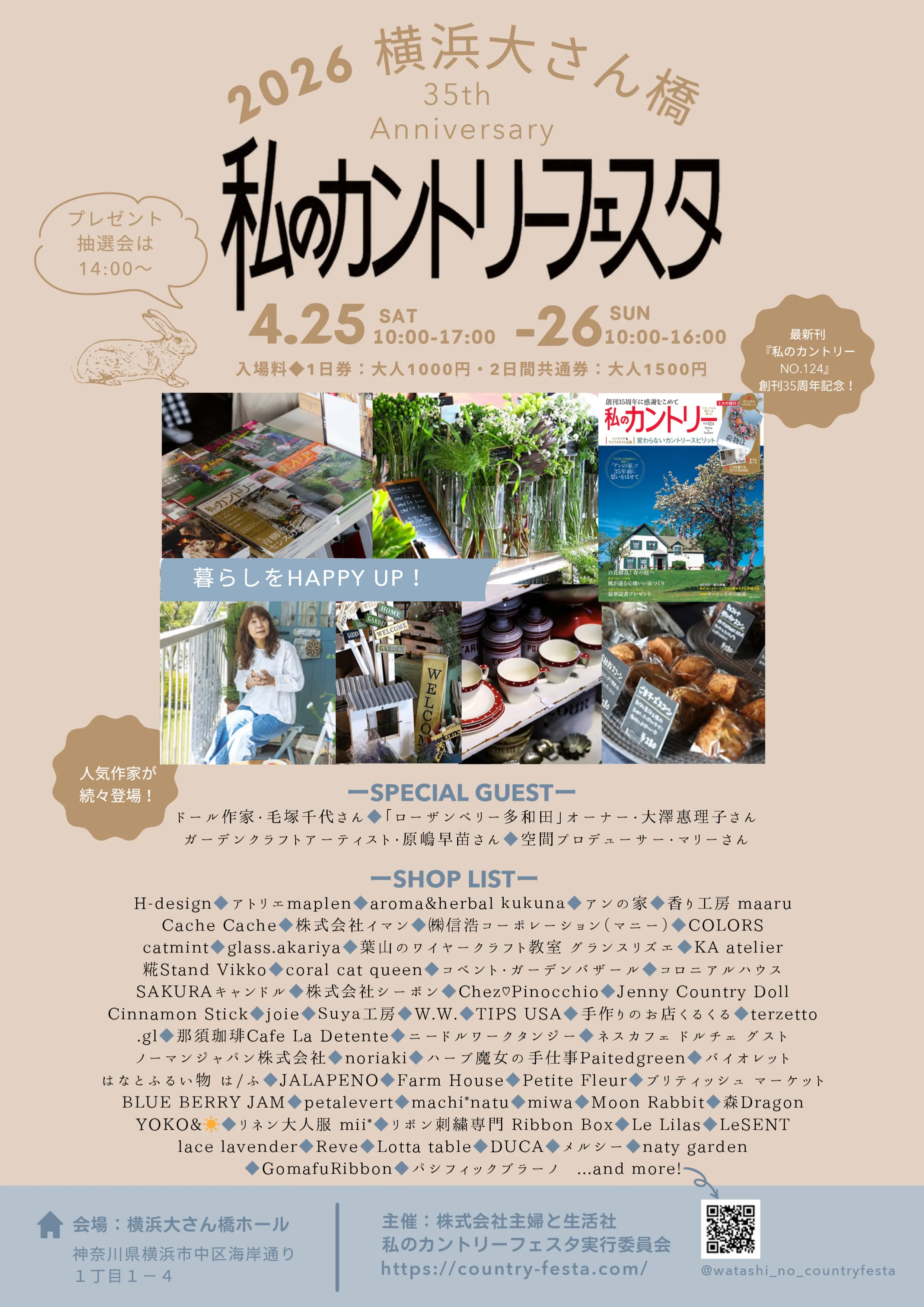 このたび、神奈川県横浜市の横浜大さん橋ホールにて開催される「私のカントリーフェスタ2026」に、昨年に引き続き出展いたします。