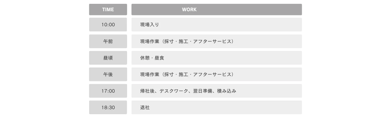 人員の整理や配置を行い、現場の状況を把握しながら効率的なスケジュールを構築。取り付けや採寸予定製品の詳細も確認し、現場作業が滞りなく進むよう準備を整えます。